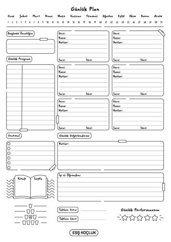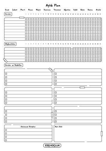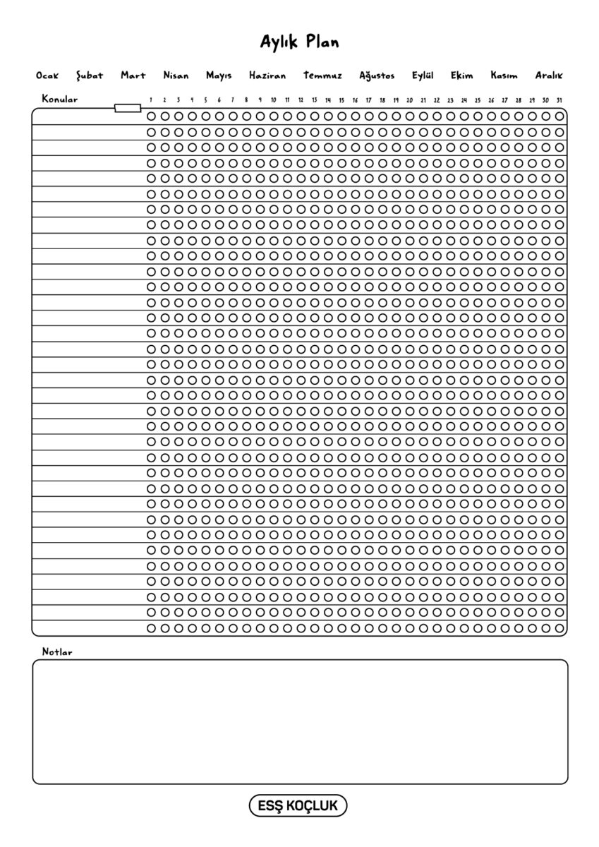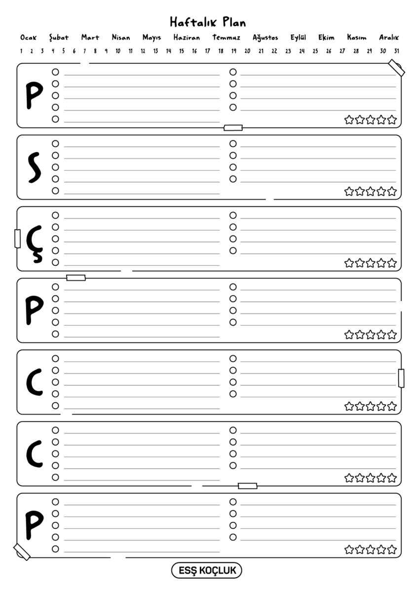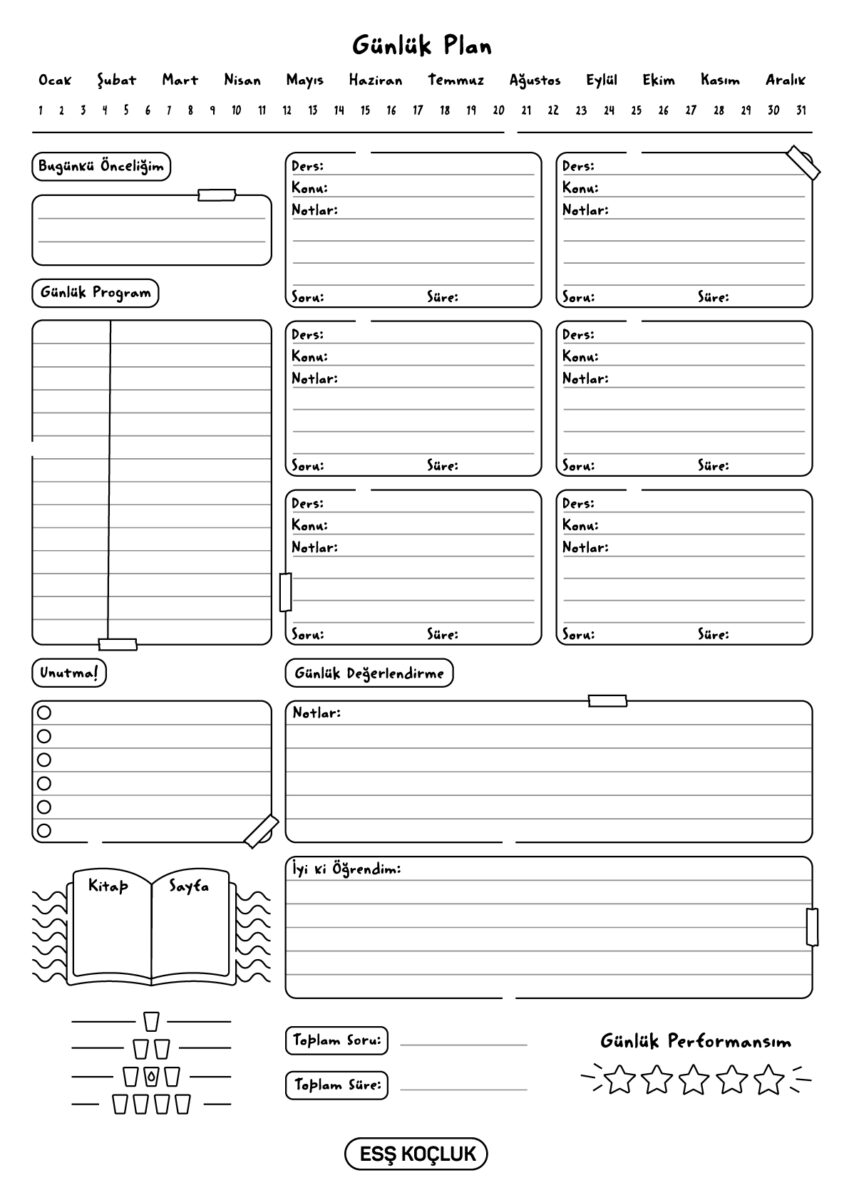 Ertan Sinan Şahin’in hazırladığı günlük, haftalık ve aylık plan ve takip çizelgelerini seninle paylaşıyoruz. Bu çizelgeleri doğru bir şekilde kullanarak çalışmalarını daha verimli hale getirebilirsin. Çıktı alıp kullanabilmen için PDF formatında siyah beyaz olarak paylaşıyoruz.
