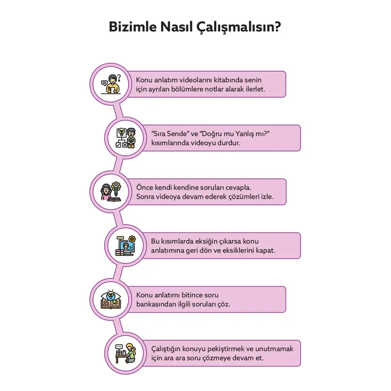 Video ders kitabını YouTube’da yer alan konu anlatım videoları ile birlikte kullanabilirsiniz. Kitap içinde özel olarak ayrılan alanlara notlar alarak konu anlatımını tamamlayın. “Sıra Sende” soruları ve “Doğru mu Yanlış mı?” kısımlarında videoyu durdurarak soruları kendiniz cevaplayın. Sonra videoya devam ederek çözümleri izleyin. Bu şekilde ilerleyerek konuyu eksiksiz öğrenebilirsiniz.